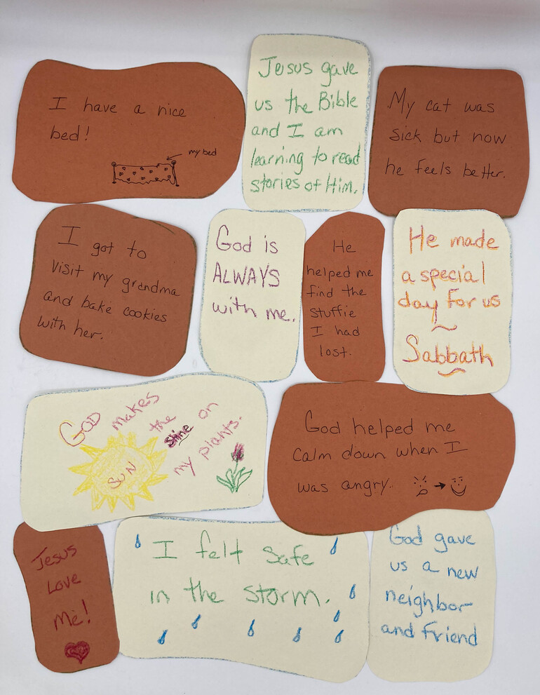 Cut out 12 stones from paper. On each stone, draw a picture or write a short sentence about something God has done for you. Here are some ideas: